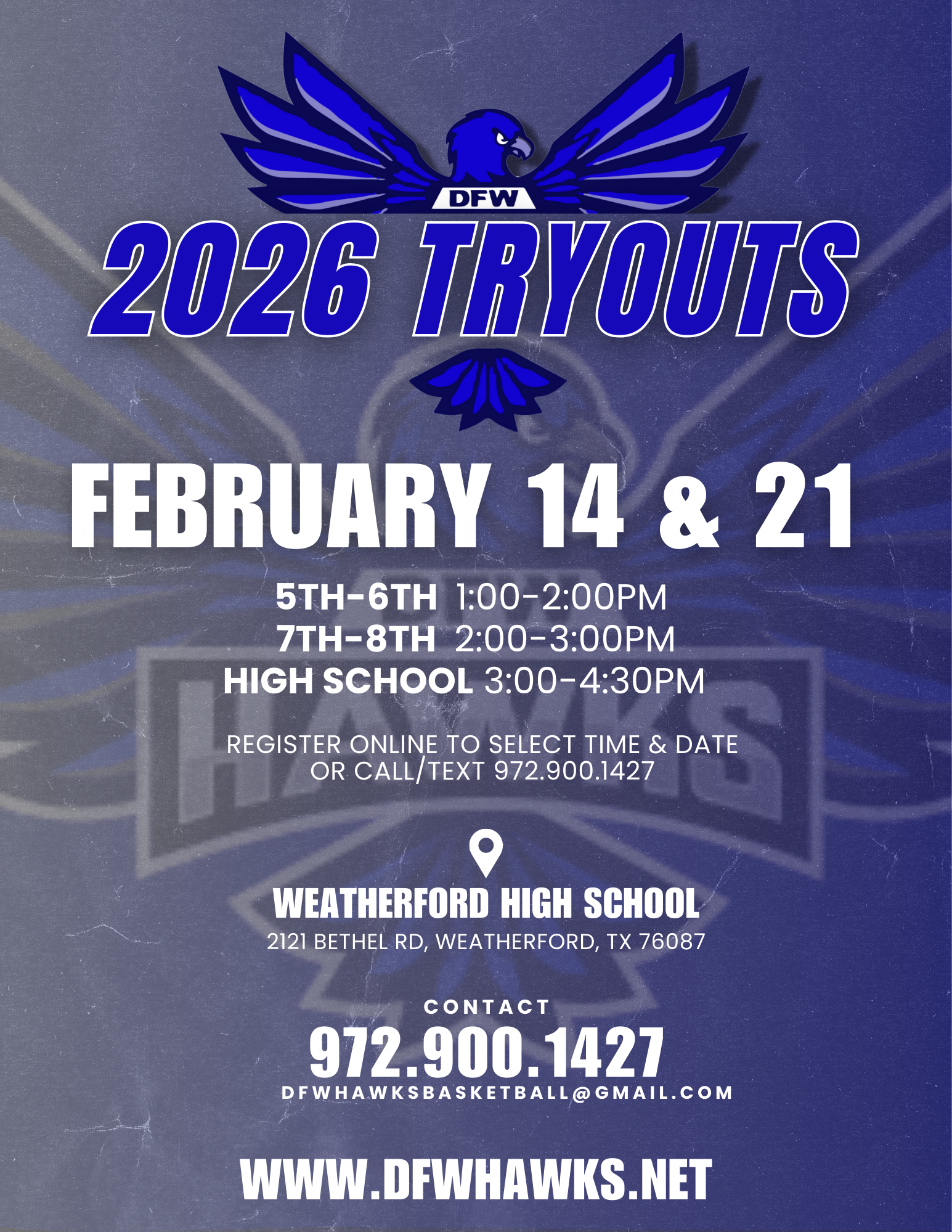 We do not have tryouts for 2nd-3rd-4th grade. If you are interested in playing in the Spring/Summer please call Derelle King at 972.900.1427 for more information.